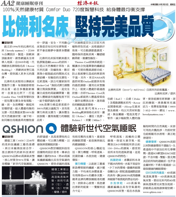 耀億工業累積40年的高科技纖維工藝技術,與日本廠商技術合作開發出劃時代的新科技素材QSHION品牌4D高涵氧床墊,3/20獲得經濟日報健康睡眠專刊報導。